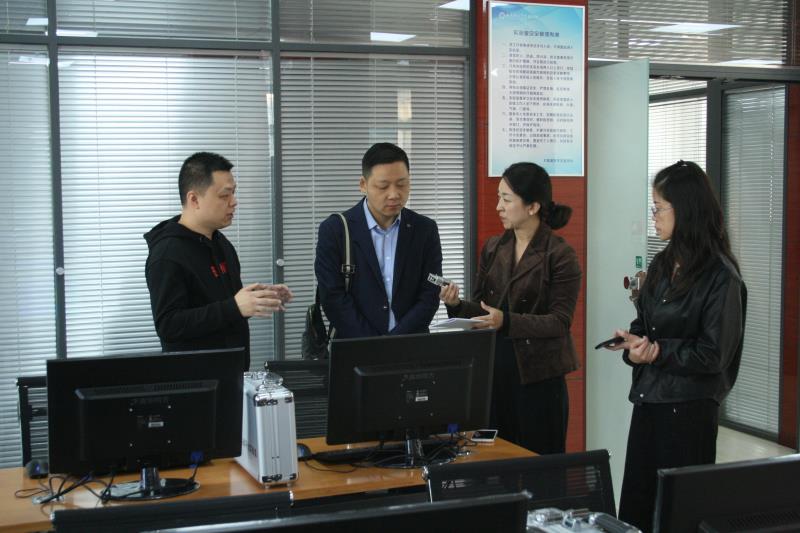 2018年10月12日上午,咸阳师范学院计算机学院副院长郭新明一行来米兰官网参观大数据技术实验室。ac米兰官方网站院长岳忠玉、副院长丁琦、计算机学院院长杨俊清、校企合作西安启光信息技术有限责任公司总经理王莺陪同参观。