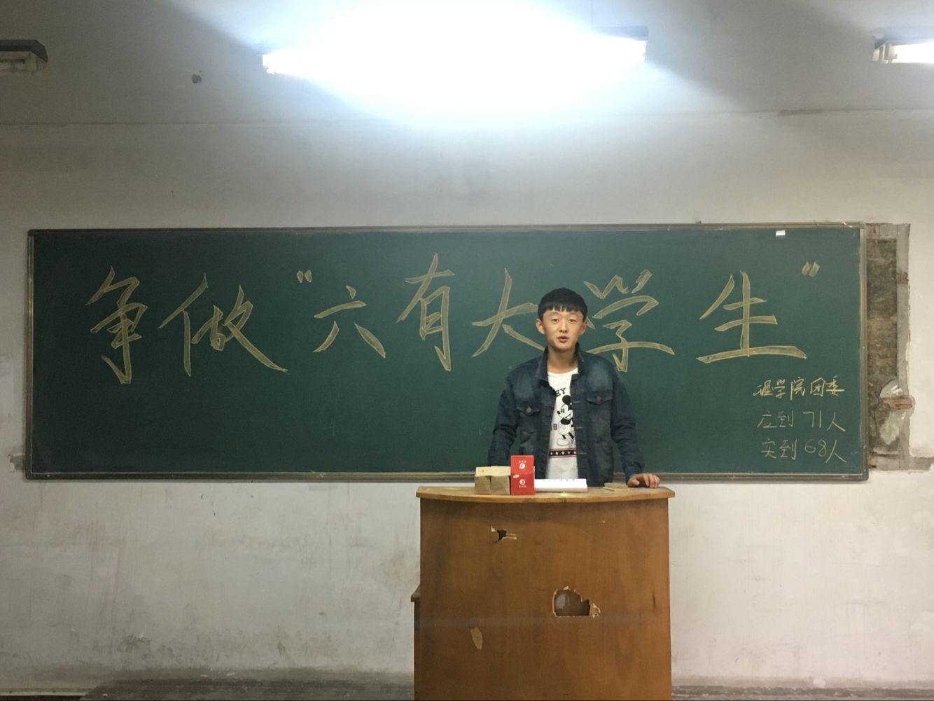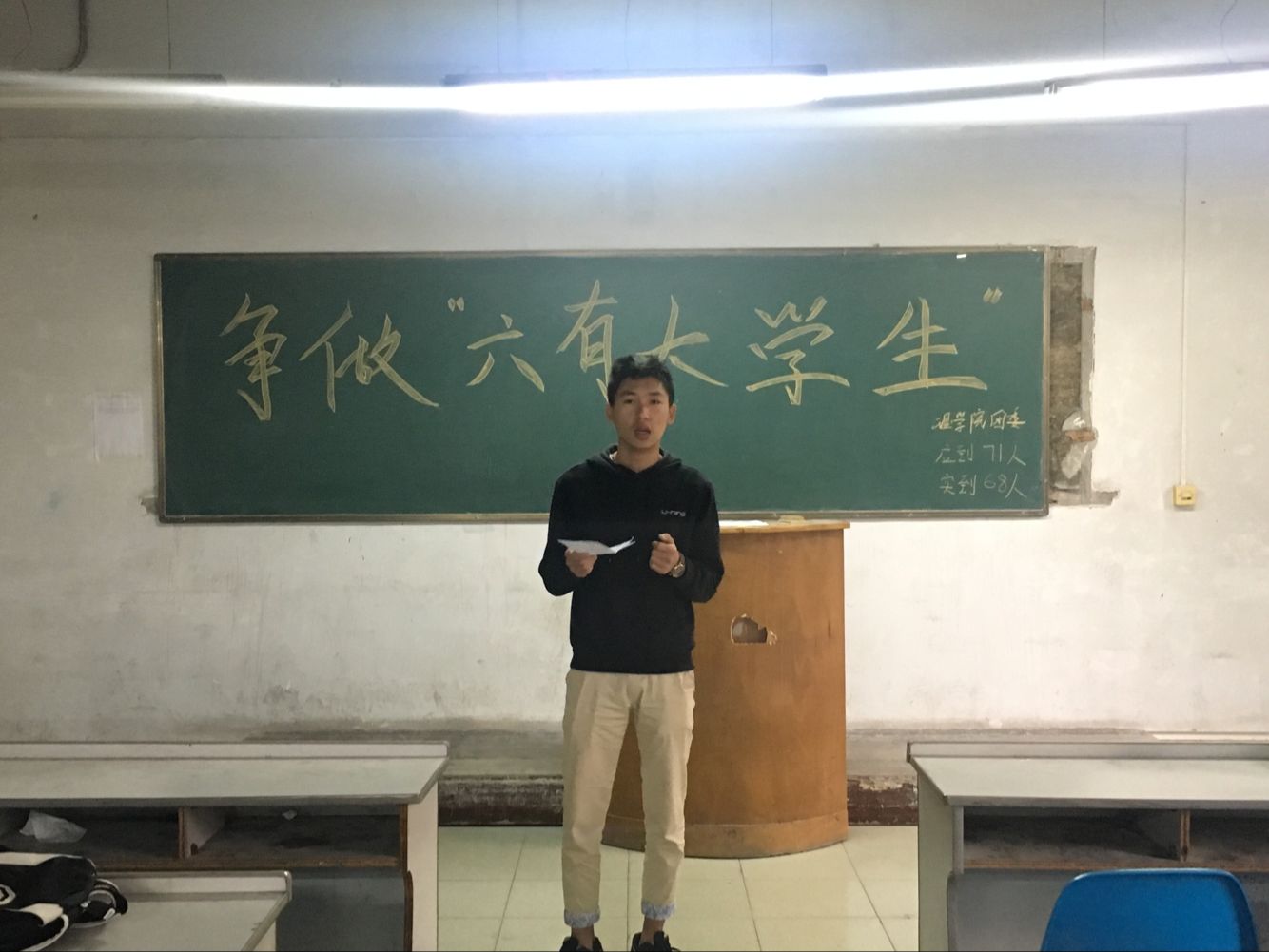 为响应习近平总书记的号召,加强学生管理,ac米兰官方网站在10月12日下午4点在北207教室举行了争做“六有”大学生主题班会。班会由组织部部长寇帅佳主持,参会人员为团总支书记杨陈东以及全体大二学生。