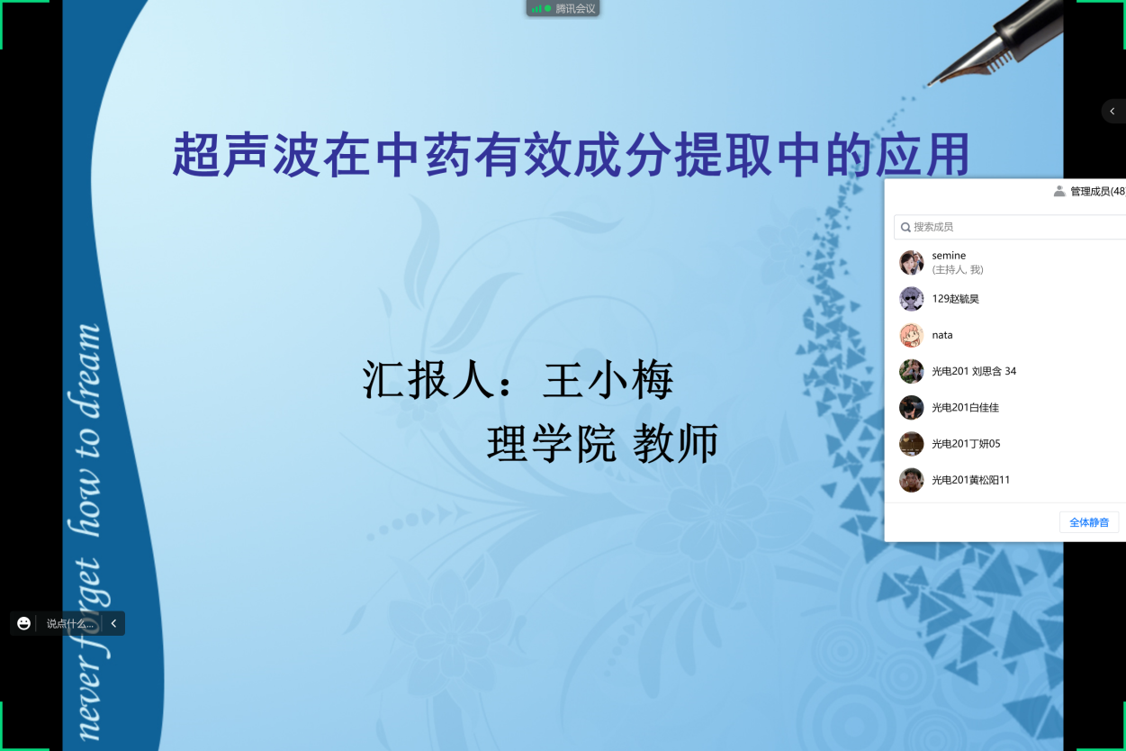 2022年9月17日,ac米兰官方网站在腾讯会议线上举办了“超声波在中药有效成分提取中的应用”学术讲座,此次讲座由物理教研室主任王小梅主讲。