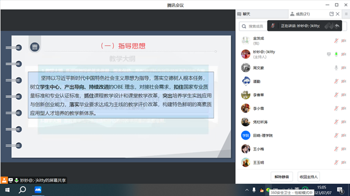 为进一步提高人才培养质量,加强课程思政建设,ac米兰官方网站物理教研室于2023年7月7日下午以线上会议方式,召开了2023版光电信息科学与工程专业教学大纲修订与编制研讨会。物理教研室全体成员参加了该会议,会议特邀了学院党总支书记胡红亮和丁琦副院长参加,金发成召集主持。