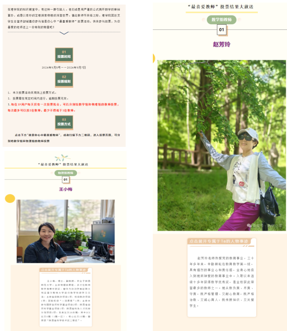 为大力宣传优秀教师典型,教师节期间在学生中开展了“我最喜欢的老师”活动,经网络投票,共评选出赵芳玲、张蒙、任炯、陈国心、王小梅、邬华春、王妙和王臣臣等八名教师,并及时在“西航小理”微信平台推出2期专题进行宣传,号召全体教师学习这八名教师热爱教育、热爱学生的情怀与坚守,唱响尊师重教主旋律。
