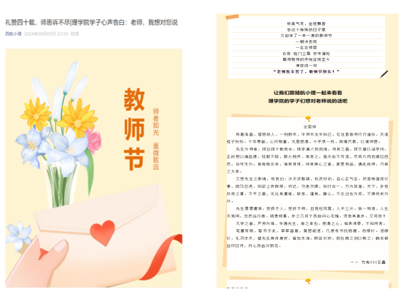 二是开展“礼赞四十载,师恩诉不尽”活动,学生通过微信等方式,以短文、诗词等形式向教师们表达他们最纯真的谢意。