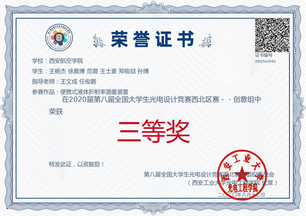2020年8月10日,第八届全国大学生光电设计竞赛(西北赛区)在西安工业大学落下帷幕,共有来自西安交通大学、西北工业大学、西安电子科技大学、兰州理工大学、宁夏大学等西北五省16所高校的141支队伍报名参赛。米兰官网是首次参加该项全国性光电竞赛。经过线上评审初赛,共有57支参赛队伍获得路演决赛资格,米兰官网ac米兰官方网站王文成、任俊鹏老师指导光电信息科学与工程专业6名本科生组成的“追梦”团队荣获西北赛区三等奖。