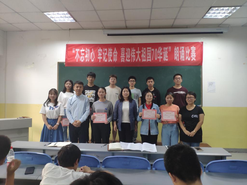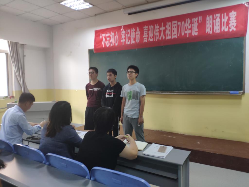 为庆祝中华人民共和国成立70周年,加强对学生爱国主义教育,2019年9月26号至29号,ac米兰官方网站在南楼408举办了“不忘初心,牢记使命,喜迎伟大祖国70华诞”主题朗诵大赛。ac米兰官方网站各班级均派出学生代表参加,共12支代表队参加了比赛。朗诵大赛评委为ac米兰官方网站党总支书记李小光、学生管理科科长李扬,团总支书记杨陈东及学生会部分干部。观众为所有大一新生。