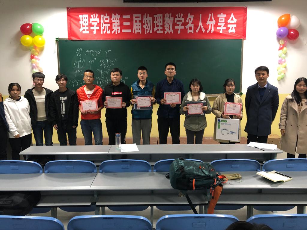 11月28号,ac米兰官方网站举办的第三届“物理数学名人分享会”决赛在南楼408教室举行。到会的有ac米兰官方网站辅导员杨陈东、张小妹、班主任王妙、李小雪、团学干部及大一大二全体学生。