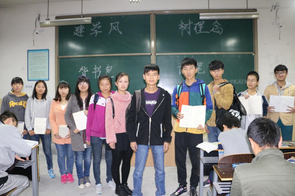 2015年10月25日,ac米兰官方网站2015级学生于主教学楼0502教室举行了“背书包、记笔记”的检查活动。活动首先由学生会自律部部长李玮和学习部部长王锦华统计各位同学笔记与背书包的情况,之后团总支社团活动部部长李阳进行有关演讲,他向同学们先后说明了背书包、记笔记的意义与作用,同学们都认真听讲,受益良多。最后学生会主席刘亚军与秘书部部长梁伟南为在此方面表现优异的同学们进行了表扬,此次活动在团总支副书记朱宗贵的结束语与同学们的掌声中画上了圆满的句号。