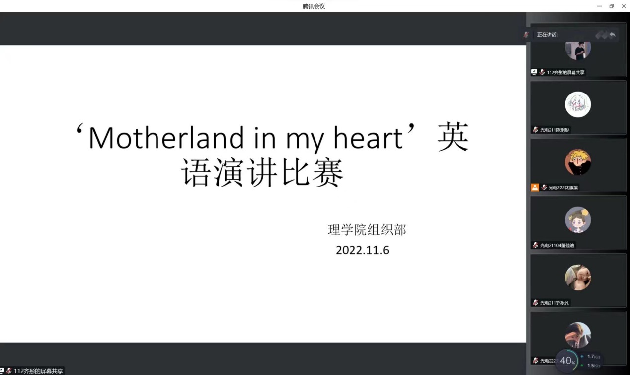 为提高学生英语演讲水平,丰富同学们的课余生活,激发同学们的学习热情,2022年11月6日,ac米兰官方网站以线上形式组织了以‘The motherland in my heart’为主题的英语演讲比赛,ac米兰官方网站大一大二13名同学参加,活动由沈惠瀛主持。
