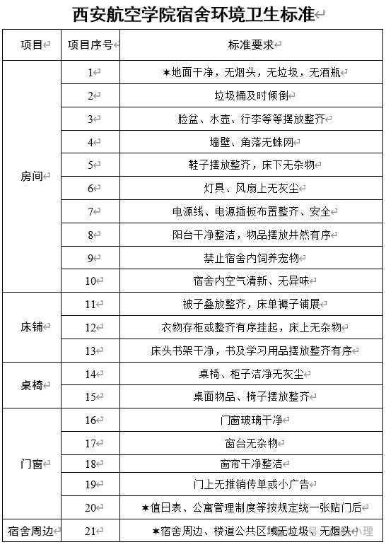 评比条件:根据宿舍卫生环境标准进行打扫及整理,宿舍整体干净有序,宿舍整洁美观、格调高雅、布置合理,文化氛围浓厚。无乱摆、乱贴、乱倒、乱拉、乱钉、乱画等现象;宿舍成员安全意识强,无私拉乱接电线绳索现象。无火灾、刑事案件或治安案件发生。