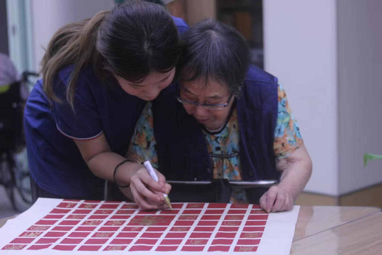 随着大家一个个在百寿图上写下“寿”字,整幅百寿图渐渐丰满起来篆隶楷行草各体皆有,或工整或洒脱,每一笔都带着书写者的温度。老人们和实践队队员围在百寿图前,指点着哪个字有气势,哪个字显秀气,眼里的光映着图上的笔迹,格外动人。“原本只是想让老人们多些乐子,没想到大家这么投入。” 照护中心负责人看着眼前的场景,语气里满是欣慰。实践队队员们也有同感,一位队员说:“和爷爷奶奶一起在百寿图上写字,感觉不是我们在付出,反而是他们让我们看到了对生活的热忱。”