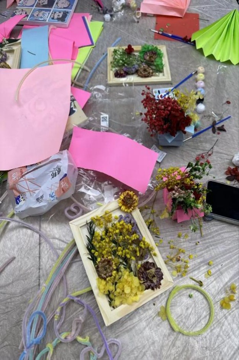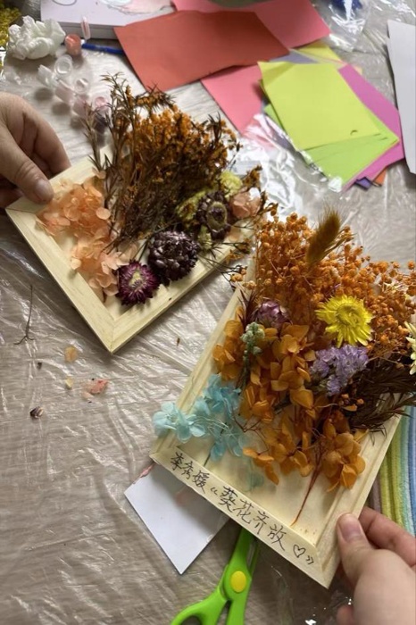 活动现场温馨而有序。实践队员们提前精心布置场地,备齐了玫瑰、雏菊、满天星等各色干花材料以及相框、胶水、剪刀等制作工具。活动伊始,志愿者们采取“一对一”或“多对一”的形式,耐心细致地为长者们讲解干花相框的制作步骤与技巧。从挑选形态优美的花朵枝叶,到构思布局、修剪搭配,再到细心粘贴固定、完成装裱,每一个环节都伴随着志愿者的手把手指导和生动演示。长者们兴致盎然,专注聆听,不时提出疑问,与志愿者们亲切交流,现场洋溢着轻松融洽、其乐融融的氛围。