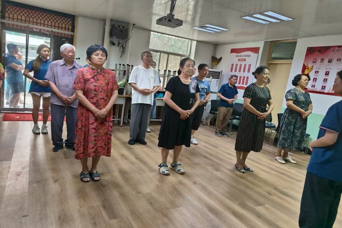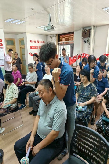 知识宣讲后,活动进入互动实践环节。在雒同学的示范和指导下,老教师们兴致盎然地学习自主按摩手法。实践队员们则化身“健康小助手”,一对一地辅助老教师们掌握要领,并运用所学技能,轻柔地为老教师们进行肩颈放松按摩,缓解日常疲劳。现场气氛温馨融洽,老教师们切实感受到来自后辈的关怀与温暖。随后,在舒缓音乐的陪伴下,闫同学和程同学带领队员与老教师们一同习练传统养生功法八段锦。一招一式,不仅弘扬了中华优秀养生文化,也有助于老教师们舒展筋骨、调和气血,现场暖意融融。