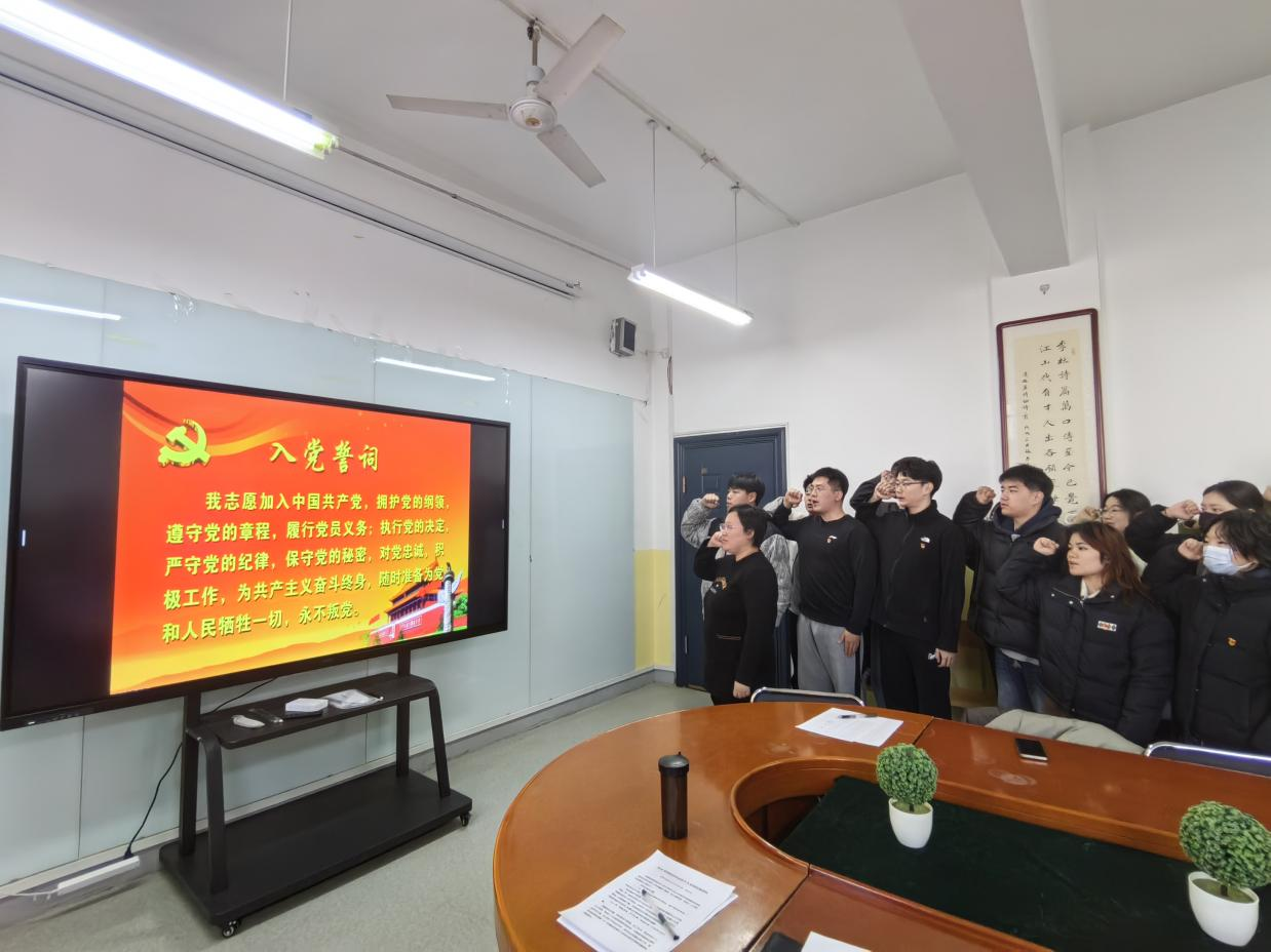 活动在庄严肃穆的《国际歌》声中开始。支部书记李扬首先领学了习近平总书记在中共中央政治局民主生活会上题为“巩固深化党纪学习教育成果,在加强党的纪律建设上发挥示范引领作用”的讲话。随后王向阳宣读了第16期预备党员名单,李扬和王向阳为他们佩戴上熠熠生辉的党徽。在支部书记李扬的领誓下,新发展党员们持立正姿势,面向党旗,举右手握拳过肩,“我志愿加入中国共产党......”,一句句铿锵有力的誓言,表达着对党的忠诚和为共产主义事业奋斗终身的决心。