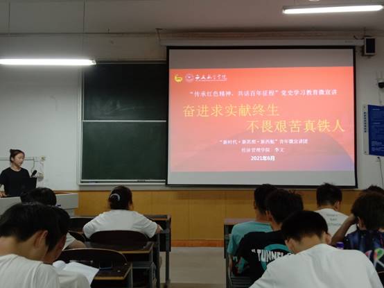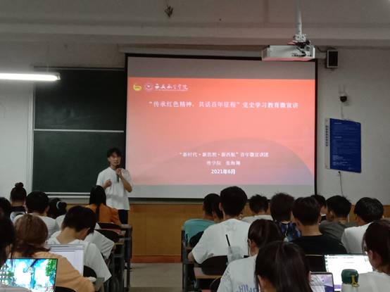 2021年6月8日,ac米兰官方网站于南楼307教室举办了“传承红色精神,共话百年征程”党史学习微宣讲,此次宣讲会由杨洁主持,ac米兰官方网站全体大一学生参加。