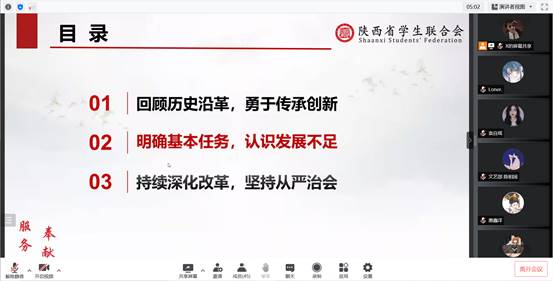 许高博就学生会历史发展进行讲解,主要强调了学生会是学生的会,不是学生干部的会,其最基本的职能是为同学服务。在新时代,学生会要牢记全心全意为同学服务的根本宗旨,发挥好党和青年学生间的桥梁和纽带作用,团结带领广大同学坚定的听党话、跟党走,不断提高学生会的大局贡献度、同学满意度、社会美誉度。自律部袁自瑶从政治性方面、先进性方面及群众性方面三个方面提出了学生会发展现状中存在的不足,并表示,学生会要“坚定跟党走,奋进新时代”。学生会主席团成员惠鑫洋带领大家集体学习了《关于推动高校学生会(研究生会)深化改革的若干意见》的出台过程、目标指向、具体举措等内容,同时也向大家说明了关于《若干意见》实施背后的考量。