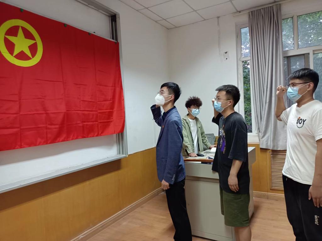 随着主持人宣布入团仪式开始,全体同学起立奏唱国歌,对国旗行注目礼。张超康向大家说明了举行入团仪式的意义,宣读了2021年新团员名单,分别是郭晓锴、董林涛、解超越三位同学,因为疫情原因,董林涛同学线上参加本仪式。