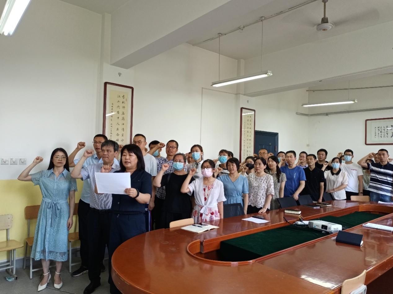 2022年6月30日,ac米兰官方网站全体党员在南楼428会议室重温入党誓词,校党委组织部杨常清列席,ac米兰官方网站党总支书记李小光、副院长丁琦、综合管理科科长杨陈东、韩慧蓉、王小梅、周千等党总支委员、各党支部书记、无课党员教师参加。会议由李小光主持。