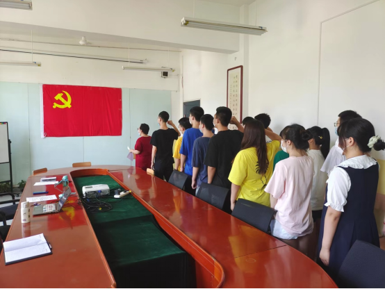 为了进一步加强党支部建设,追忆革命历史丰碑,传承高尚革新精神,丰富党员政治生活,同时加强对党员的思想教育。2022年7月1日中午十二点,ac米兰官方网站学生党支部于教学南楼428教室开展了“忆初心,强党性,共前行”主题党日活动暨入党宣誓仪式,学生支部书记李扬、组织委员潘灵刚、宣传委员张岩、正式党员及支部本学年新发展党员参加此次活动。会议由李扬老师主持。