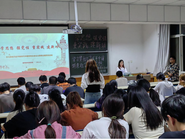 首先,主题党日活动主持人传达了4月3日学习贯彻习近平新时代中国特色社会主义思想主题教育工作会议中的讲话精神。其次,围绕“习近平新时代中国特色社会主义思想”开展交流研讨,并就主要内容、鲜明特色和重大意义等进行深入学习。随后,与会成员分享了各自学习习近平新时代中国特色社会主义思想过程中的收获与心得。最后,辅导员王向阳动员全体成员认真学习领会习近平总书记会议中的重要讲话精神,牢牢把握落实好“学思想,强党性,重实践,建新功”的总要求,切实提高思想认识,做到认识与实践相结合、理论与实际相联系,把学习成果转化为具体成效,体现到实际行动中去。