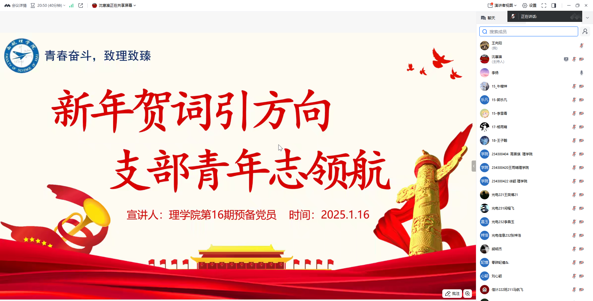 2025年1月16日ac米兰官方网站学生支部组织开展了以“新年贺词引方向,理院青年志领航”为主题的党日活动,学习习近平主席二〇二五年新年贺词,激励广大学生党员在新的一年里挺膺担当、奋发有为。支部全体党员参加,此次活动由组织委员王向阳老师主持。