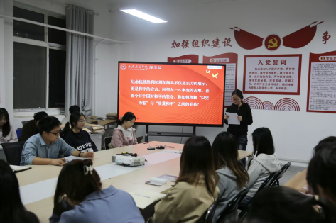 第十九期积极分子负责人王欣欣从“九一八”事变的时代背景、事件经过及历史影响三方面带领大家共同回顾了那段没齿难忘的历史。与会人员围绕“回望九一八事变的苦难,再看今日中国对和平的坚守,你如何理解‘以史为鉴’与‘珍爱和平’之间的关系?”的议题展开热烈讨论,一致表示在今后的学习和生活中,将铭记历史、勿忘国耻,以史为鉴、砥砺前行,充分发挥先锋模范作用,努力成长为堪当民族复兴重任的时代新人。