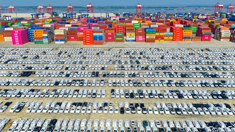 2025年10月4日在江苏省港口集团南京港龙潭港区拍摄的准备装船出口的汽车(无人机照片)。新华社发(杨素平 摄)
