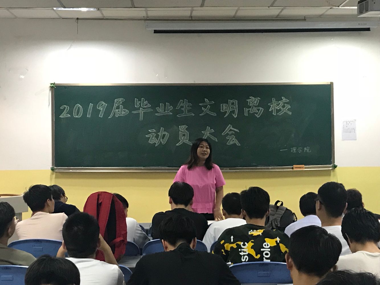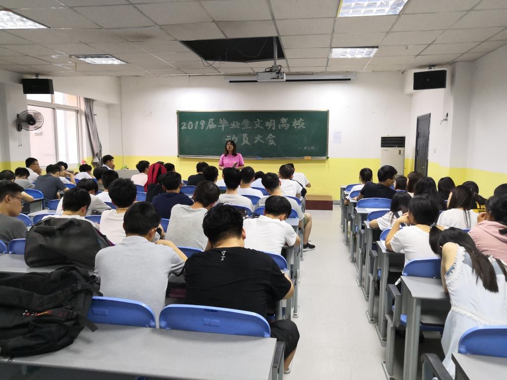 为提高毕业生文明离校意识,做好毕业生文明离校工作,6月13日19点30分,ac米兰官方网站在南楼408教室召开了2019届毕业生文明离校动员大会。ac米兰官方网站党总支书记李小光、学生管理科科长李扬、辅导员杨陈东和全体2019届毕业生参加了会议。会议由李扬主持。