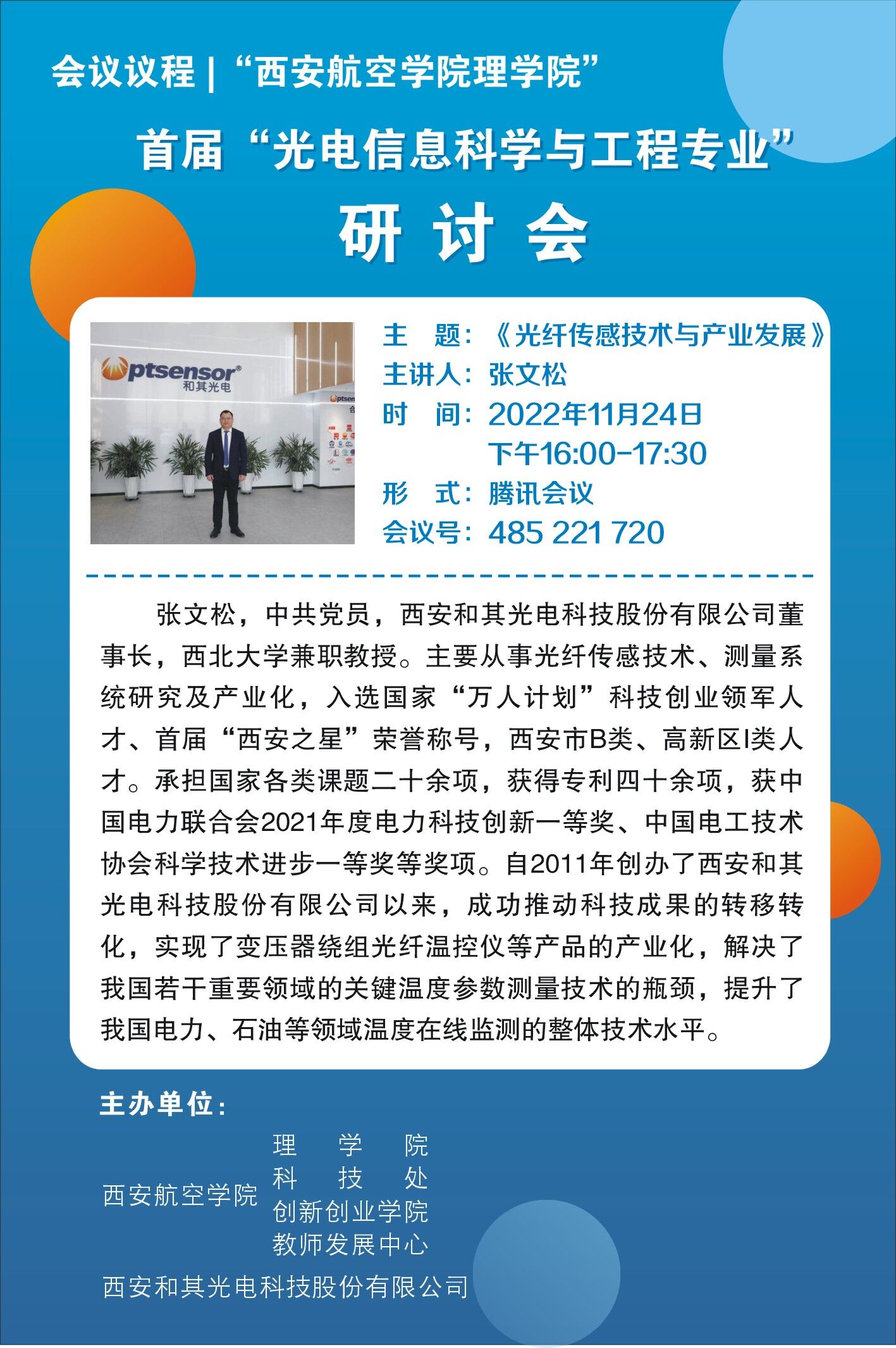 2022年11月24日下午,西安和其光电科技股份有限公司董事长张文松应邀面向全校师生作了题为“光纤传感技术与产业发展”的讲座。ac米兰官方网站党总支书记李小光、副院长丁琦及全体物理教师和光电信息科学与工程专业的学生参加了本次讲座,讲座由ac米兰官方网站党总支书记李小光主持。